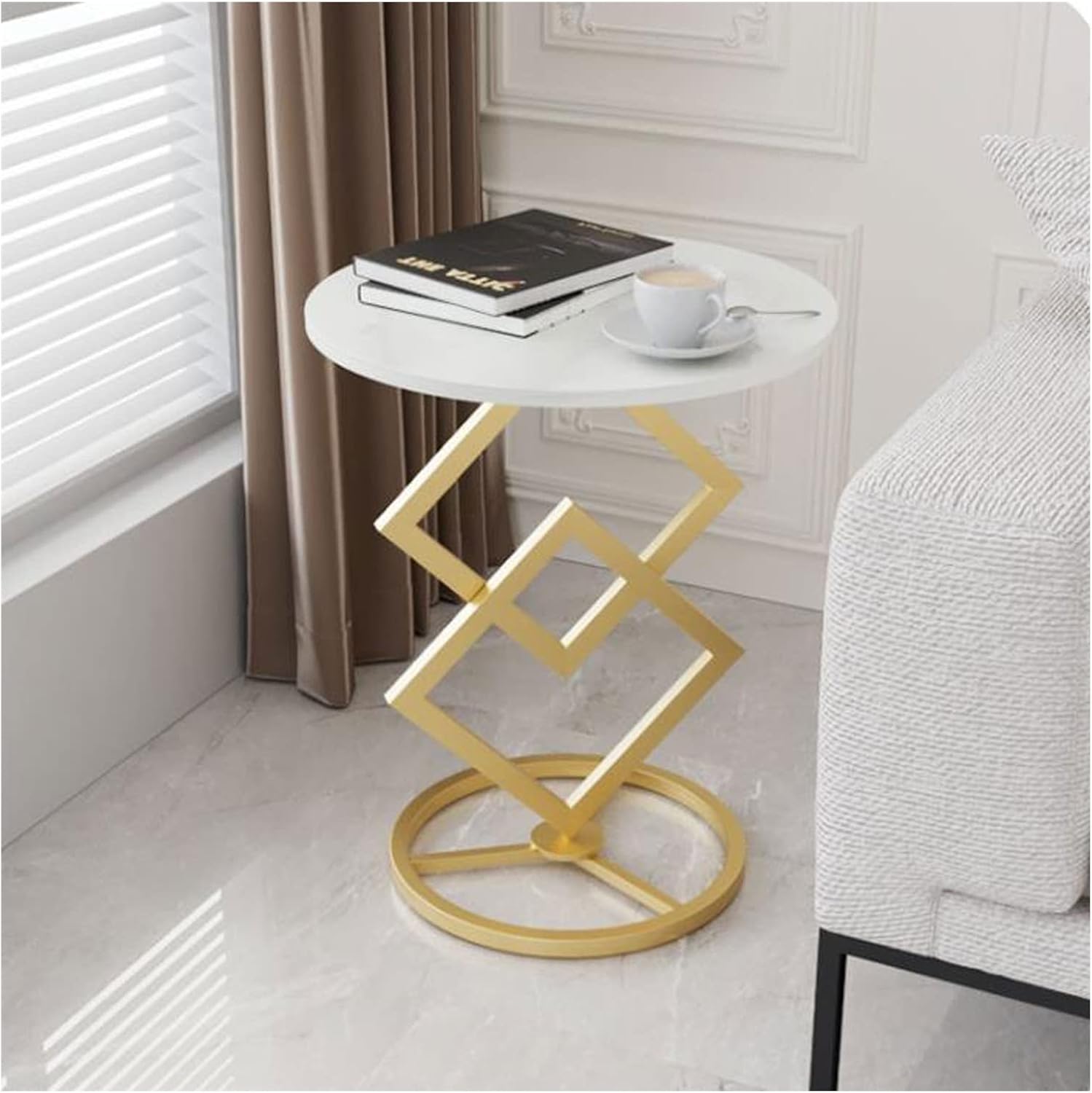 Blatul rotund cu efect marmura alba aduce un look rafinat si luminos, in timp ce cadrul metalic geometric creeaza un impact vizual puternic. Designul tip “artistic frame” cu forme suprapuse nu este doar estetic, ci si extrem de stabil, oferind sustinere sigura in utilizare zilnica.