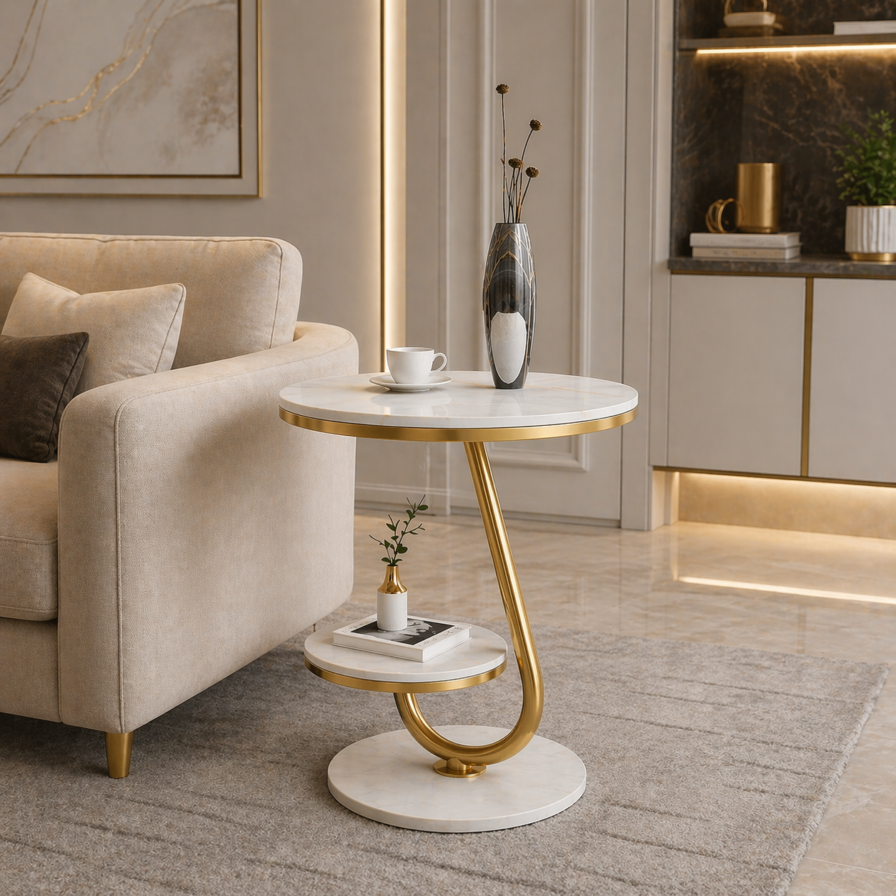 Designul pe doua niveluri optimizeaza spatiul fara a incarca vizual incaperea. Blatul superior este ideal pentru cafea, decoratiuni sau obiecte esentiale, in timp ce raftul inferior permite organizarea discreta a revistelor, cartilor sau accesoriilor.